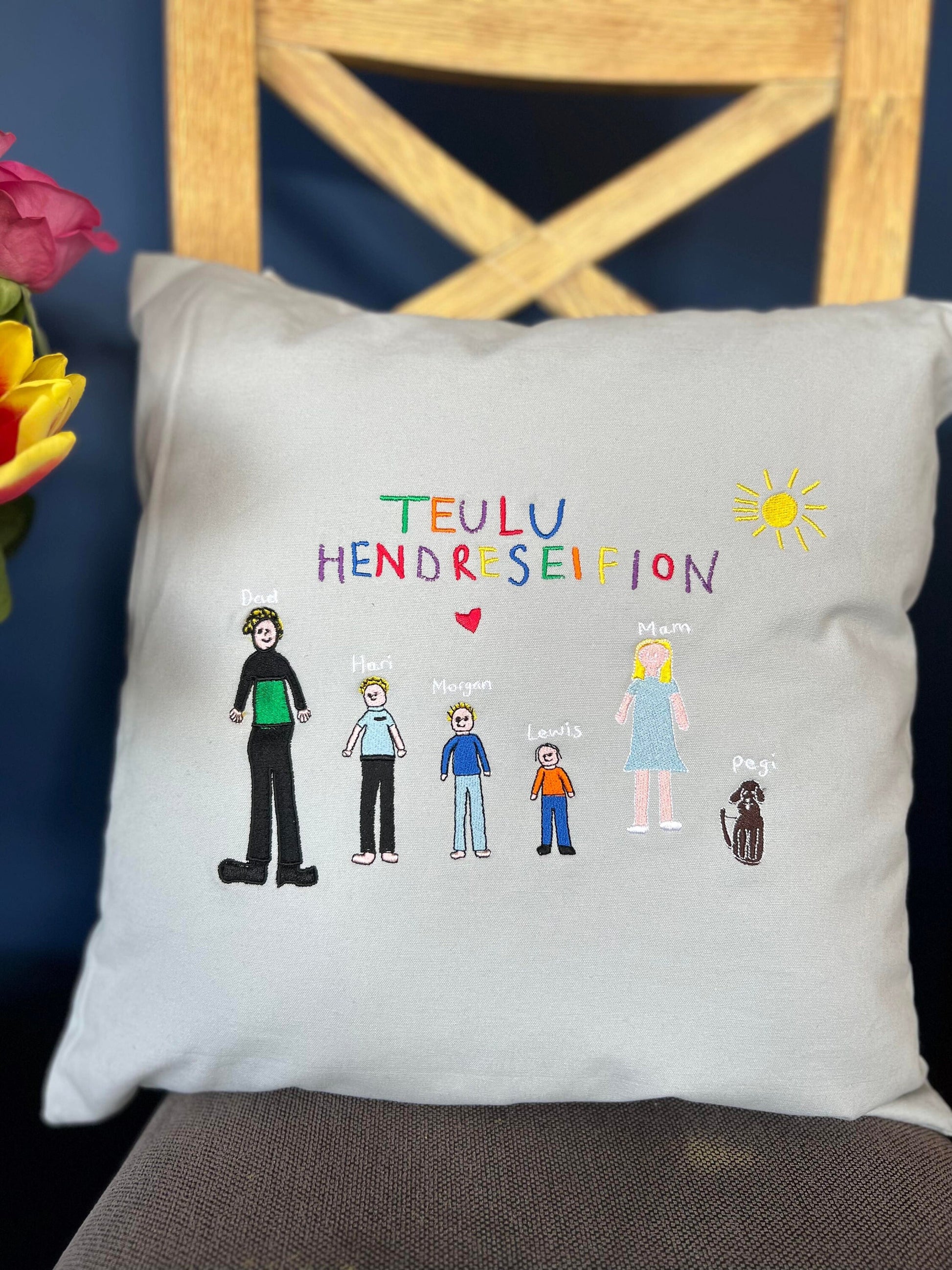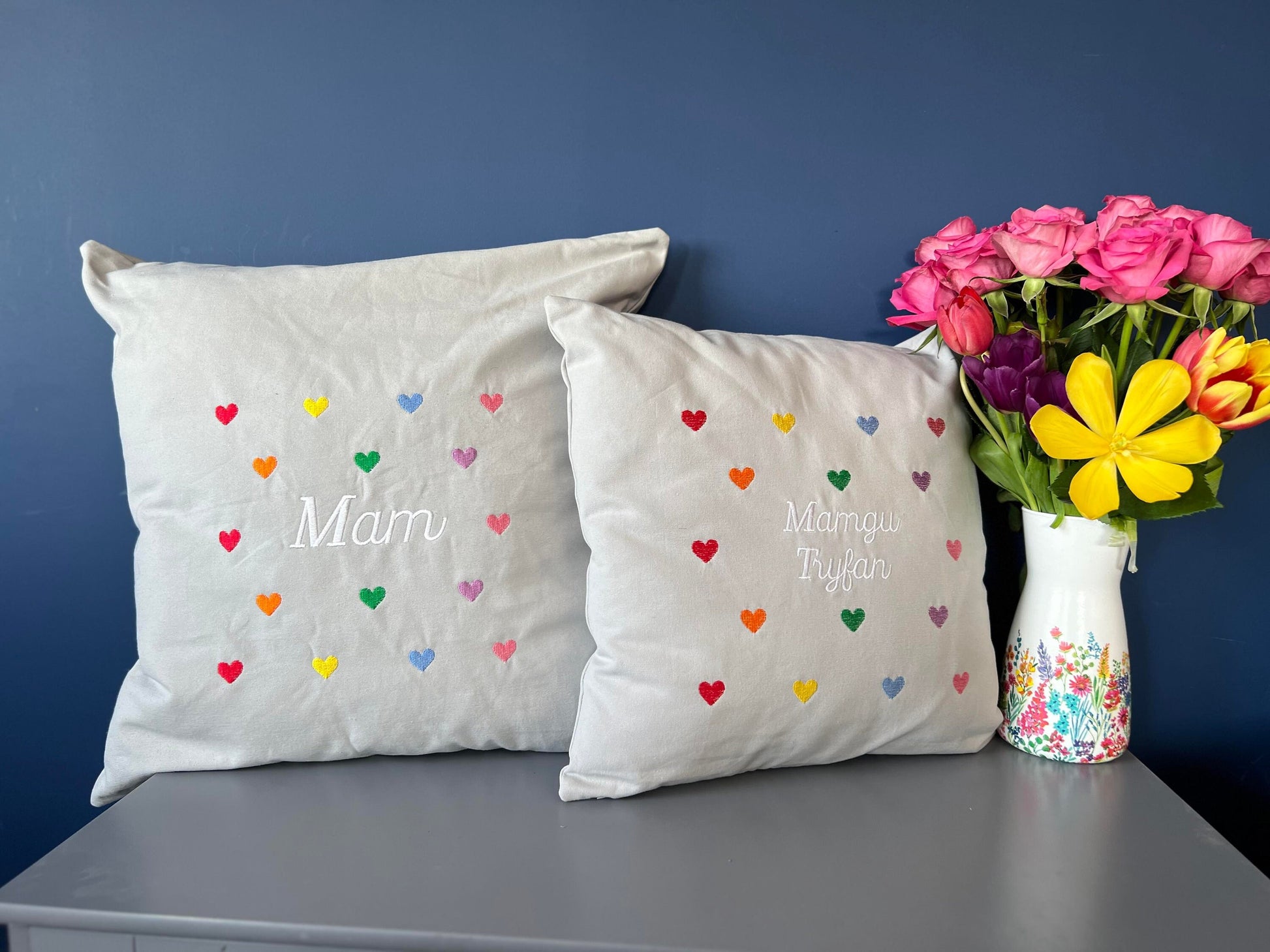 Clustog wedi brodio- yn berffaith ar gyfer Sul y Mamau neu unrhyw achlysur!