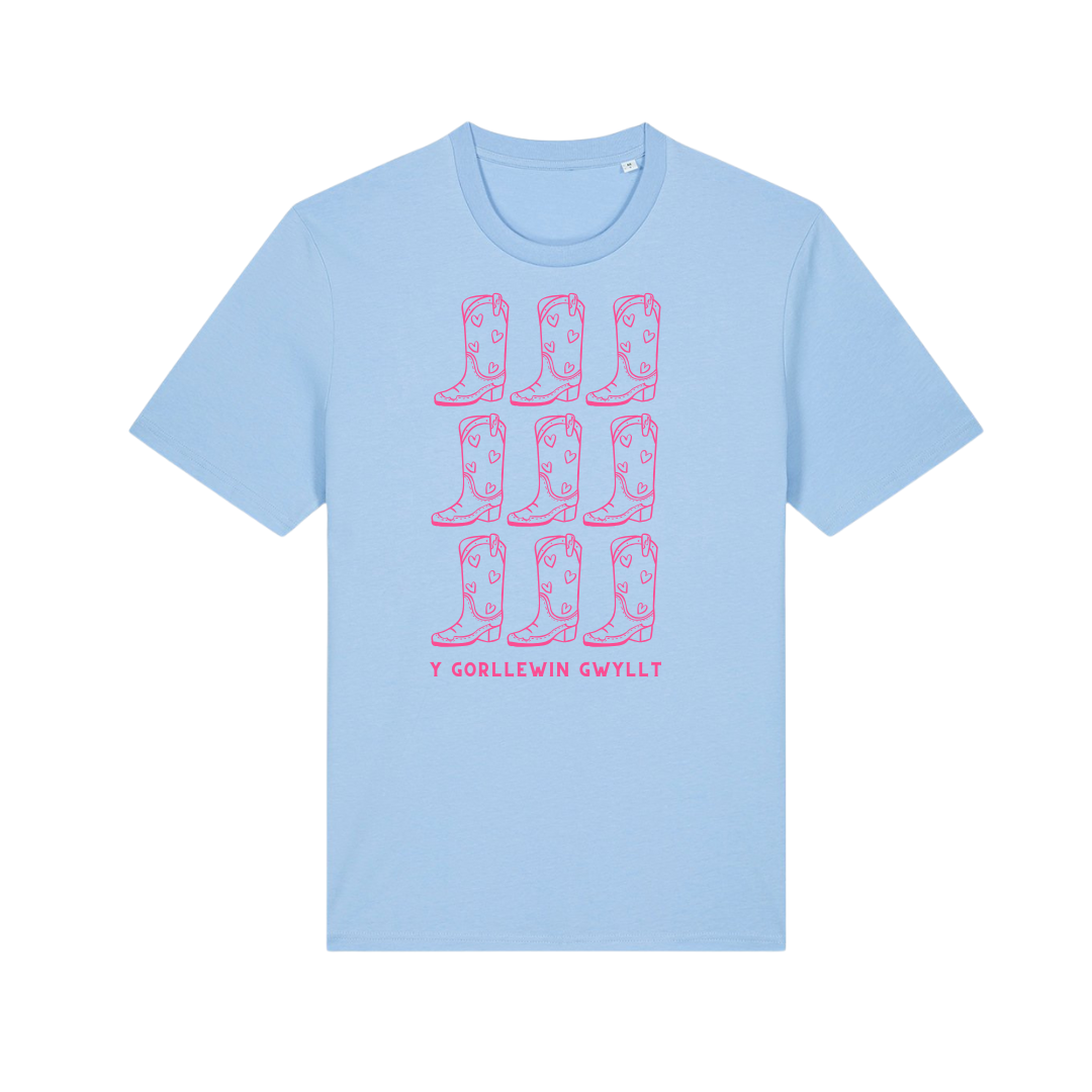 This tee has a large transfer front, 'Y Gorllewin Gwyllt' translates to 'The Wild West'.