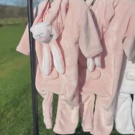 Onesies hyfryd, cynnes ar gyfer y rhai bach | Hooded rabbit all-in-one in super-soft plush fabric. Floppy ears, eyes and nose details are decorated on the hood.