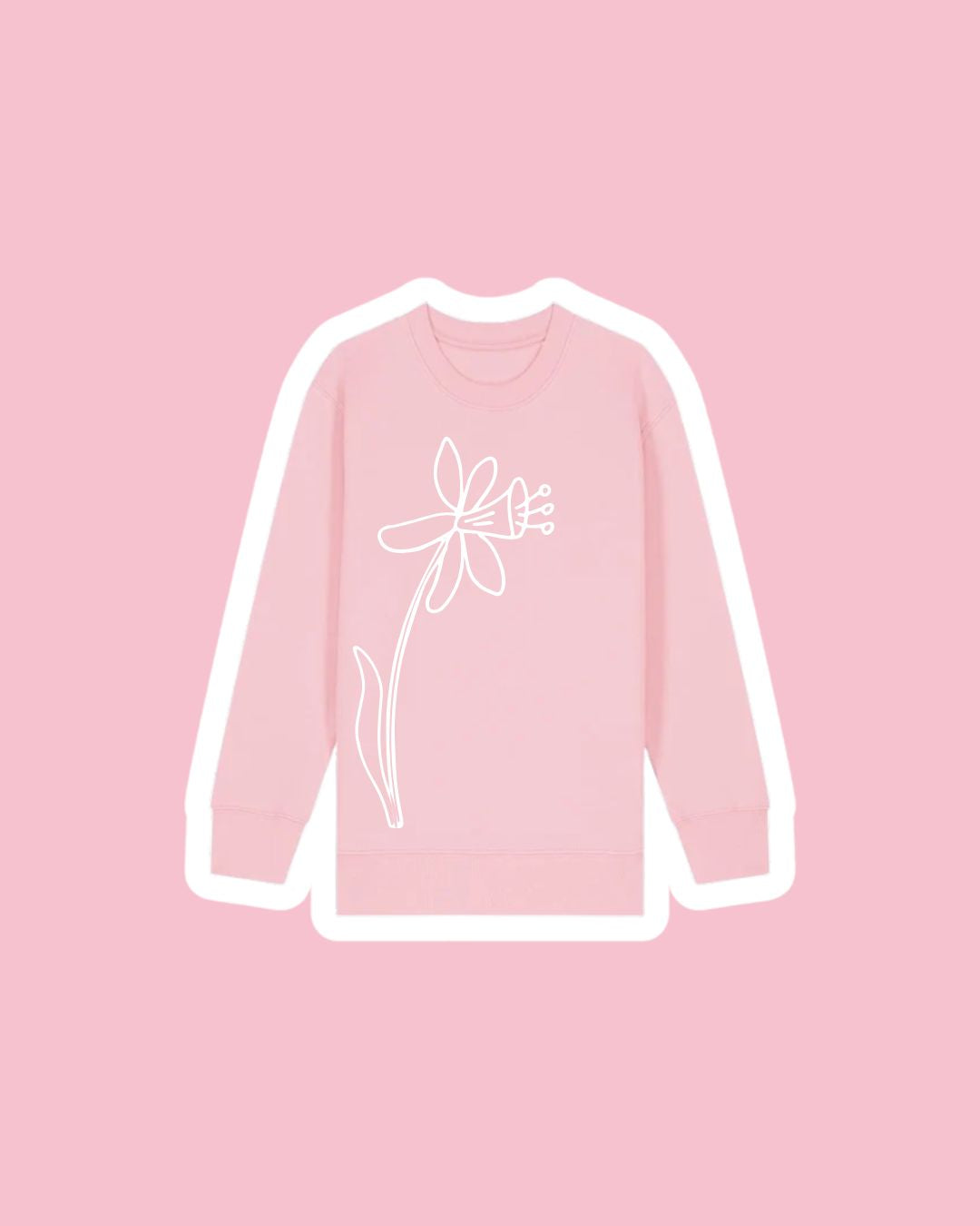A children's sweatshirt with an transfer print of an outline of a daffodil, perfect for Dydd Gwyl Dewi as well as all year round.