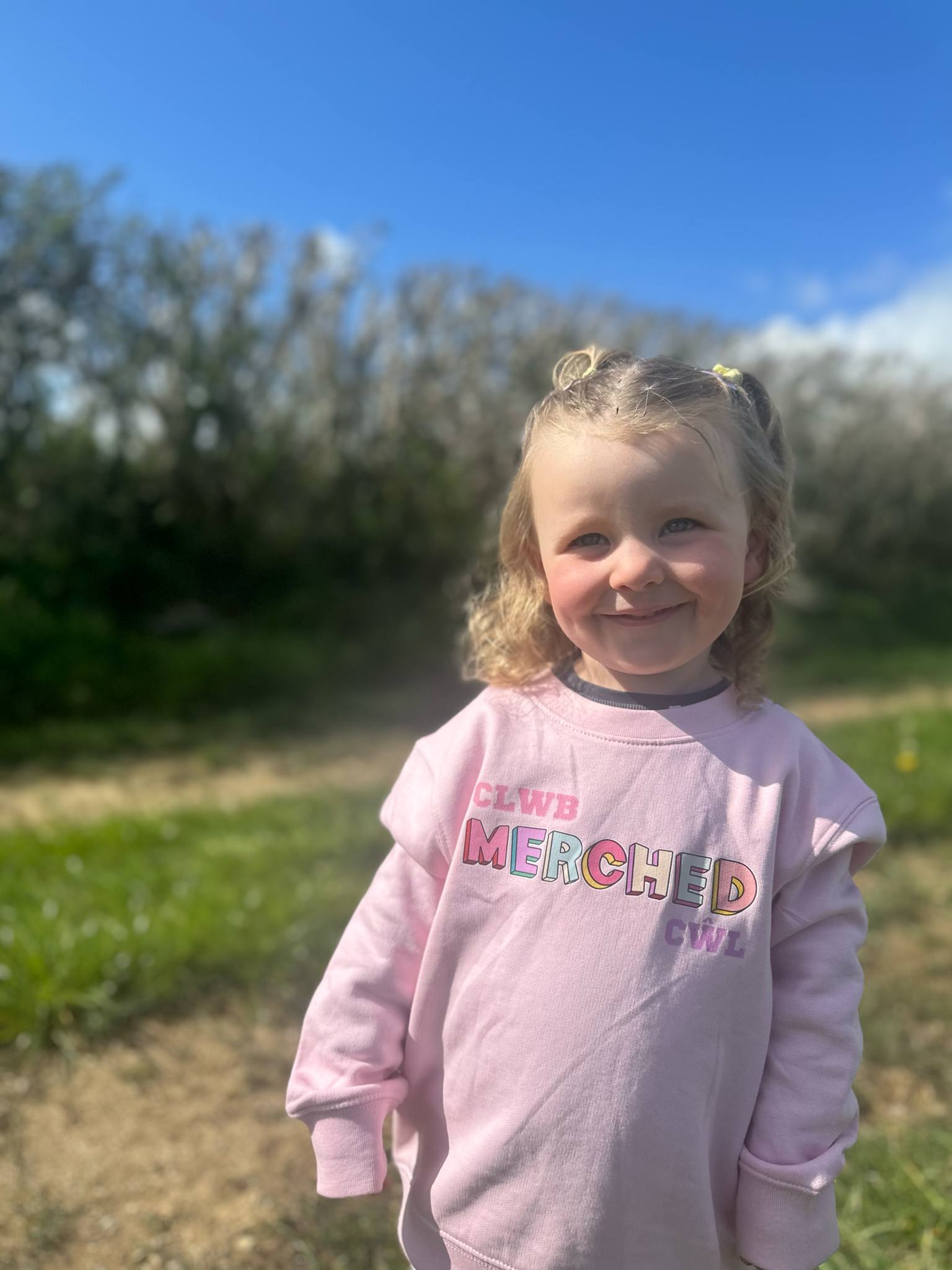 These sweatshirts have a transfer front and back. 'Clwb Merched Cŵl' translates to 'Cool Girls Club'.
