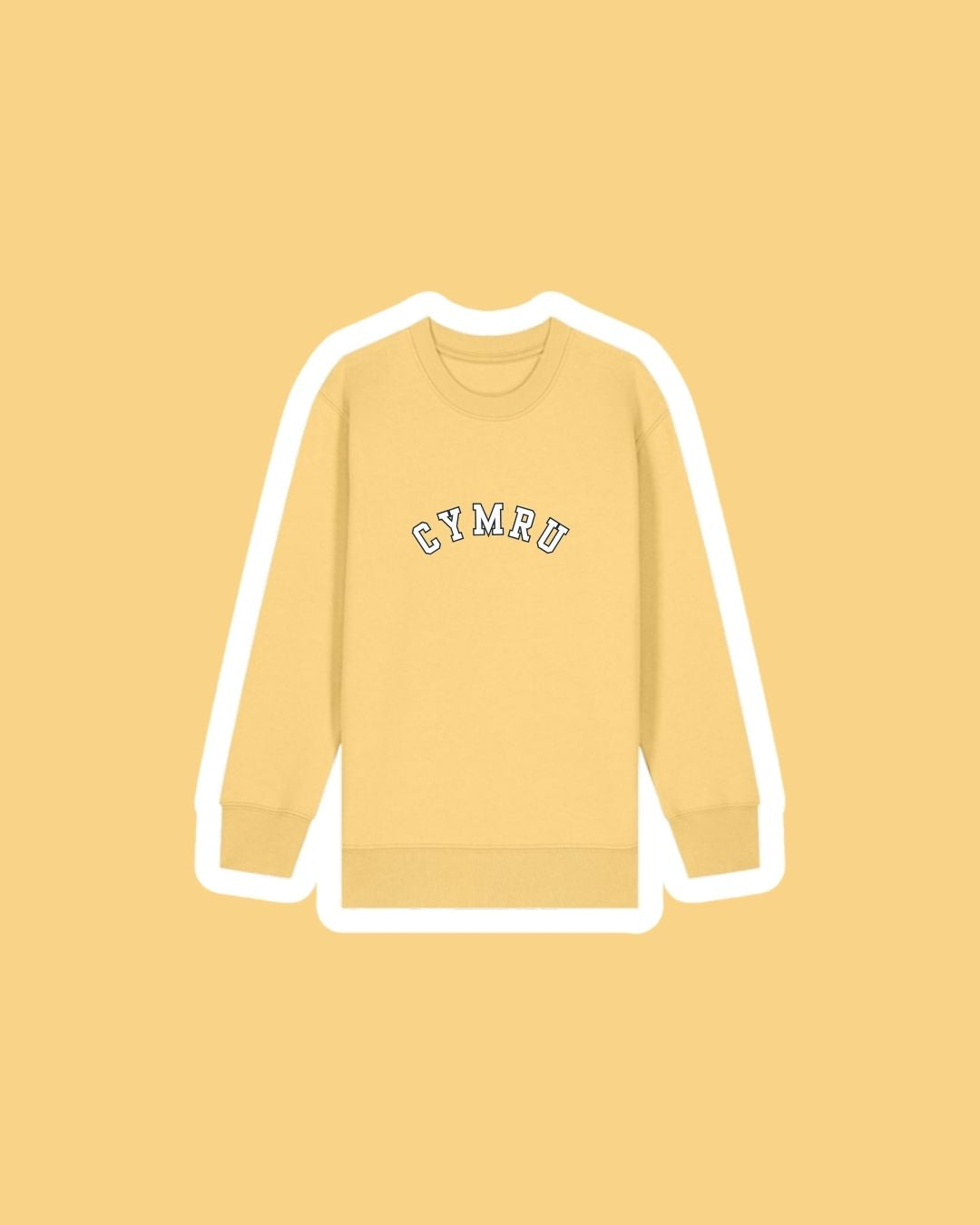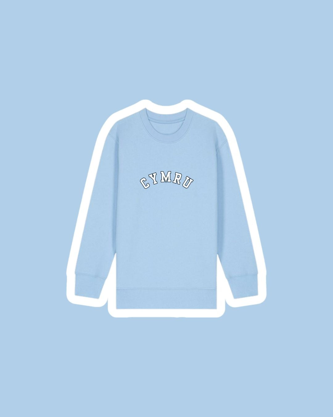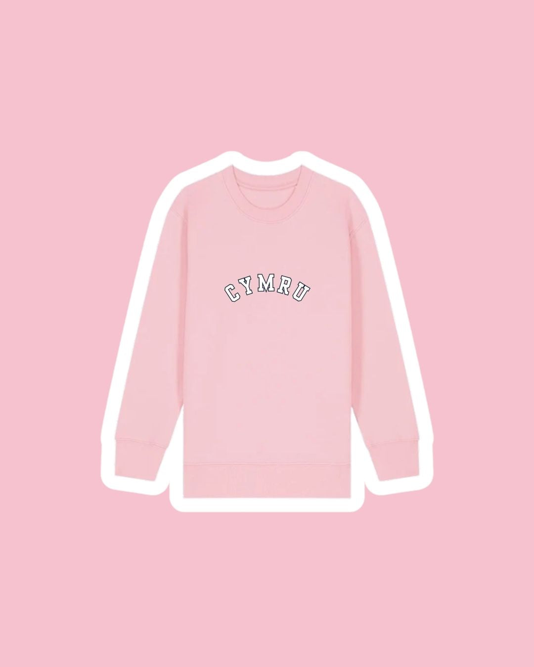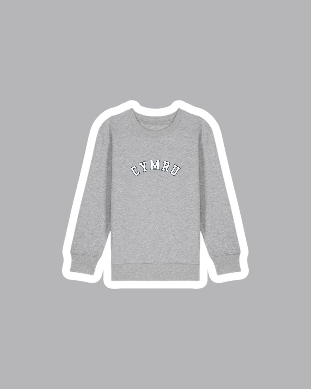 A children's sweatshirt with a varsity style embroidered 'Cymru' on the front which means 'Wales'