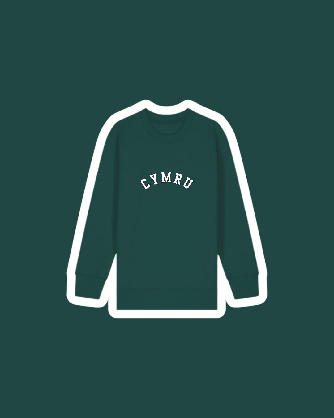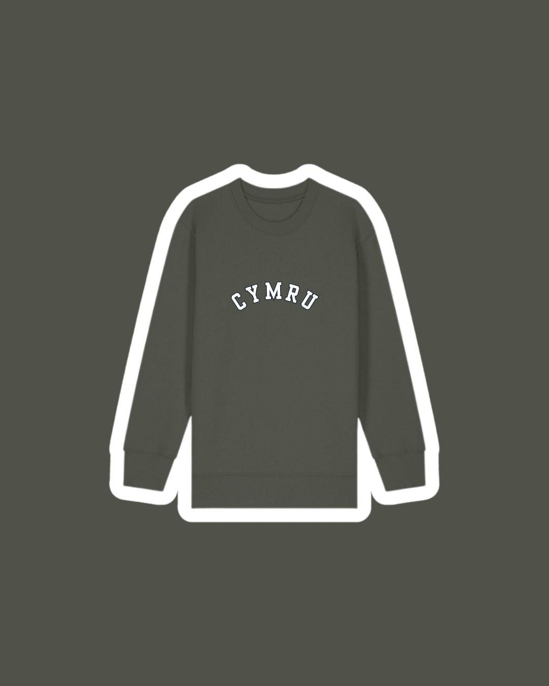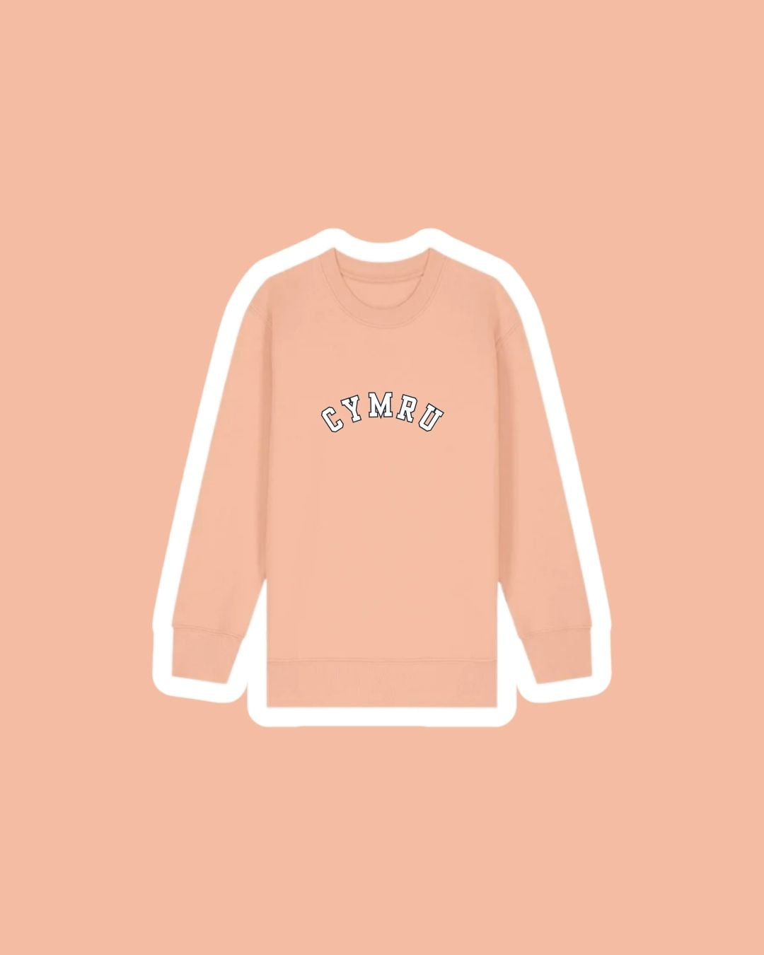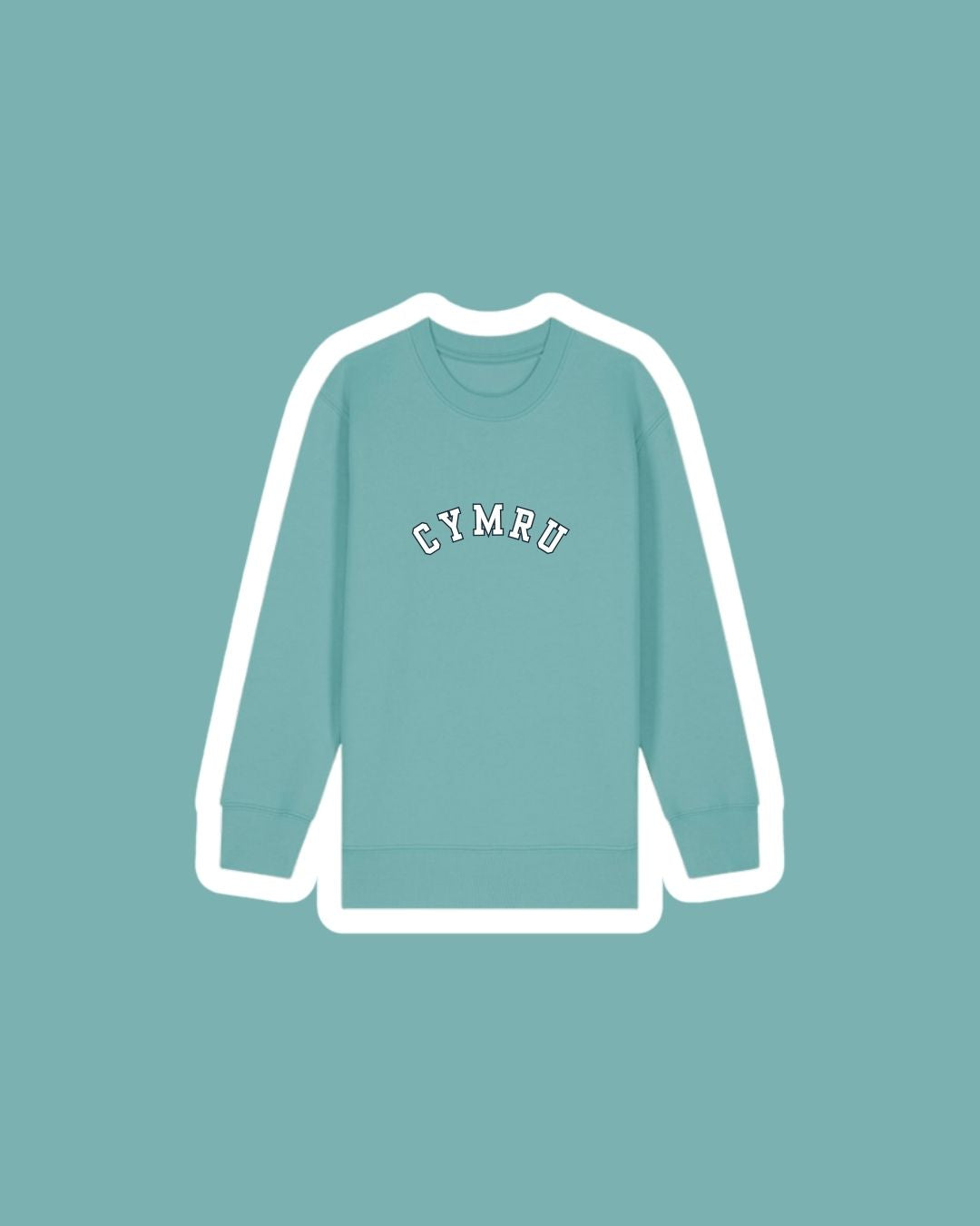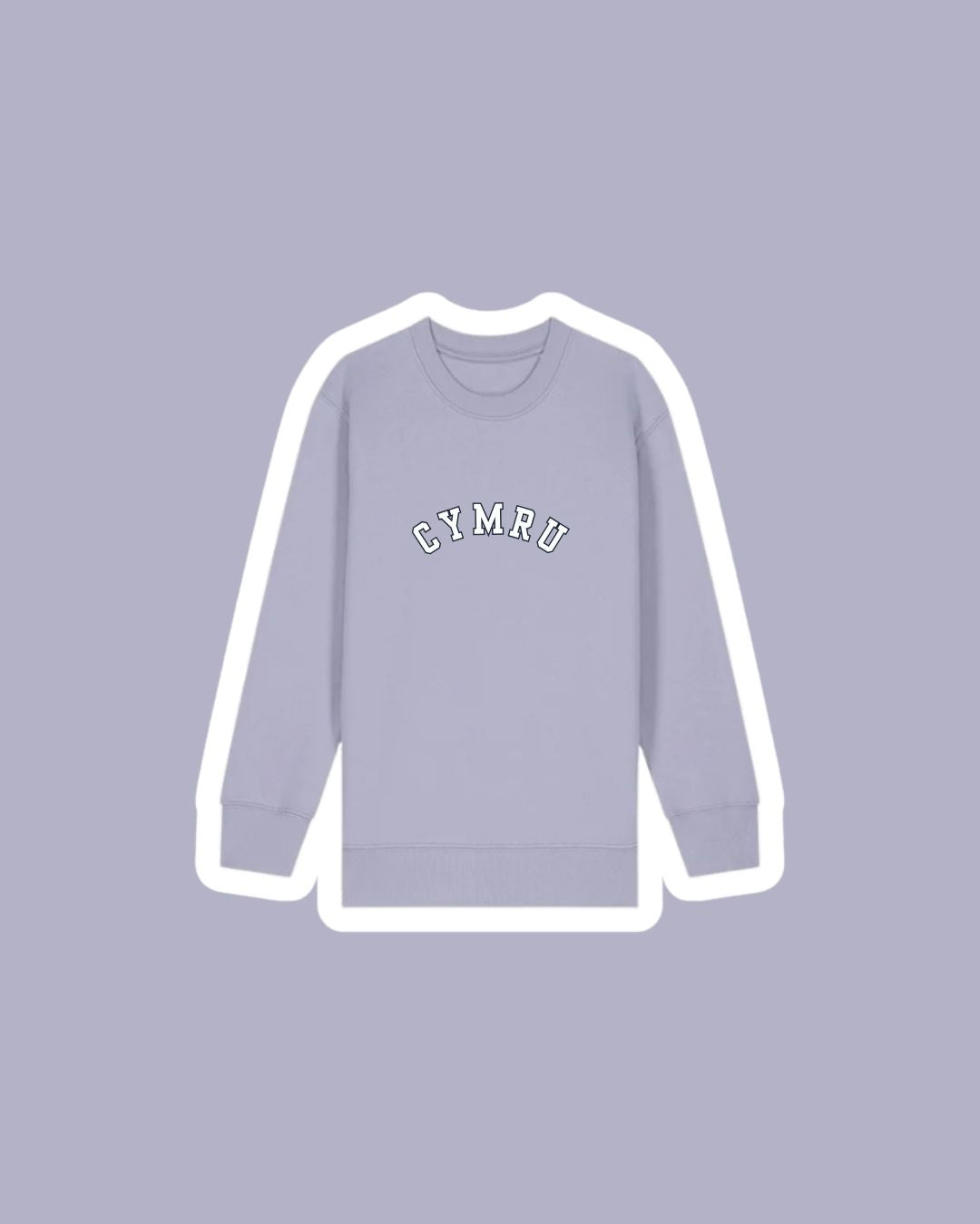 A children's sweatshirt with a varsity style embroidered 'Cymru' on the front which means 'Wales'