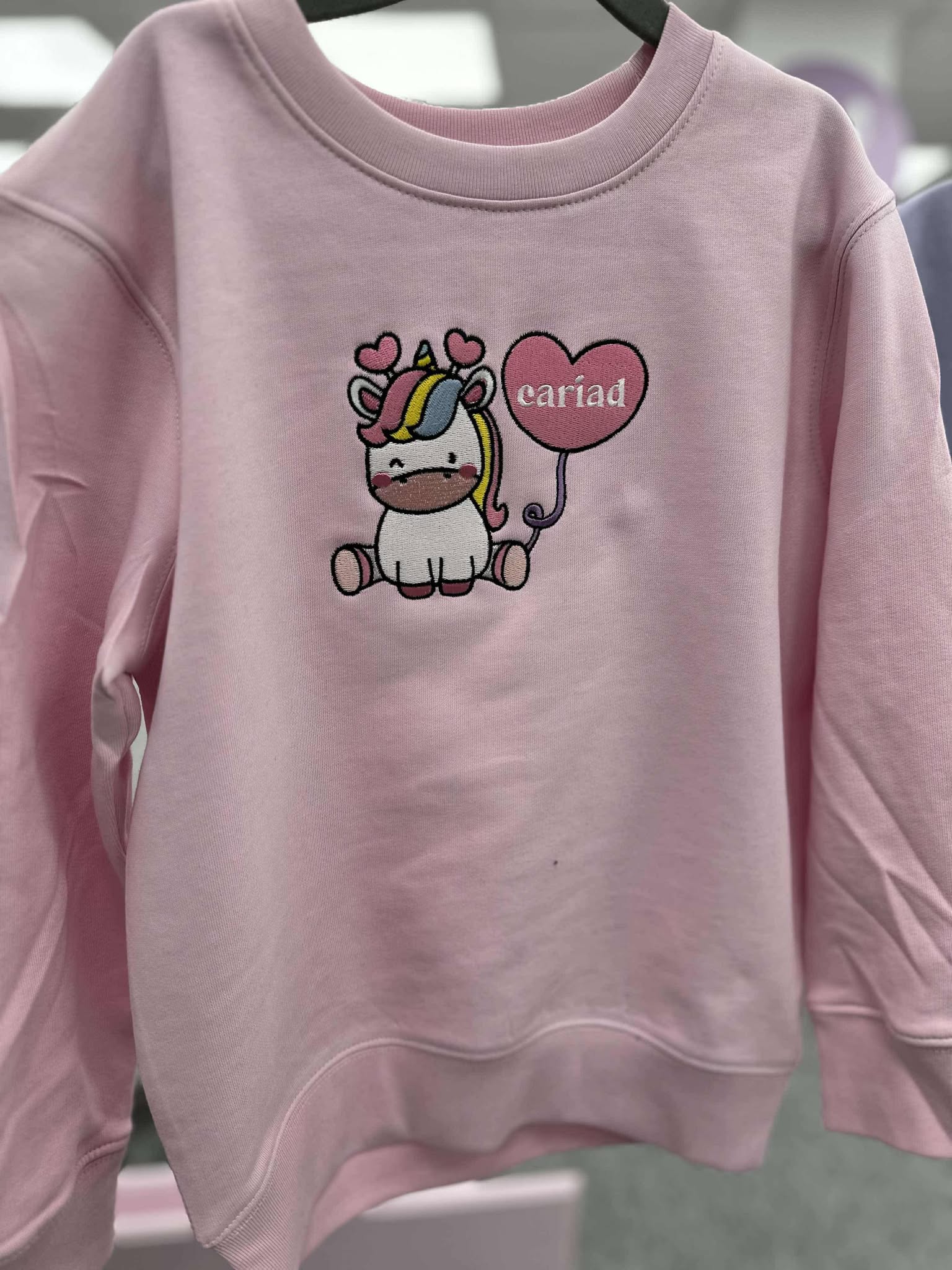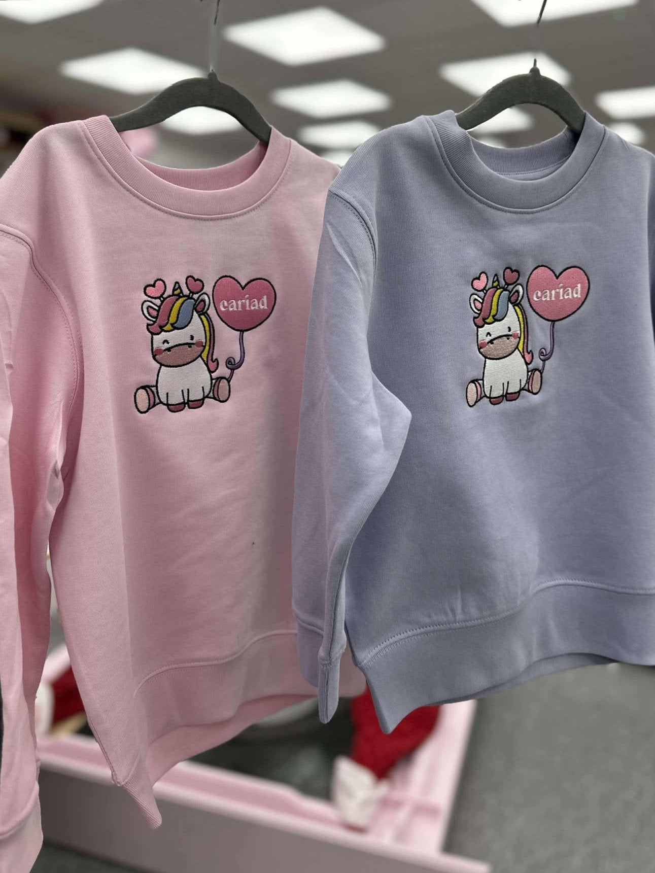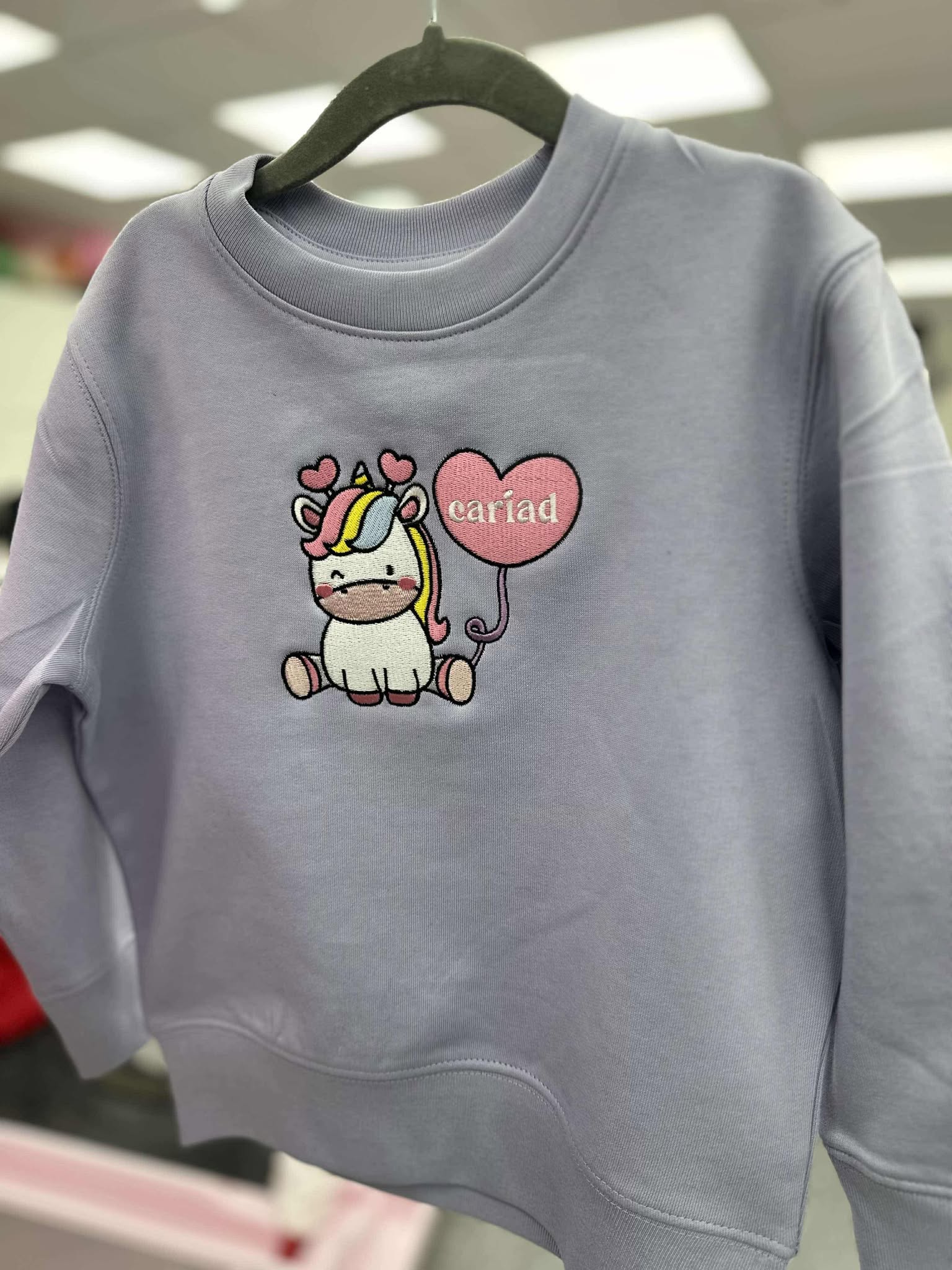 Front: Embroided unicorn design with 'Cariad' wording, translating from Welsh to English as 'Love'.