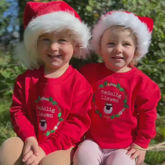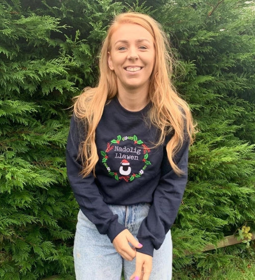 This design is a gorgeous embroided design. This is actually a throwback to my first every Christmas jumper back in 2025, hence why it's called the 'OG' (original). The text reads 'Nadolig Llawen' which is Welsh for 'Merry Christmas' and is in a regular, white thread.
