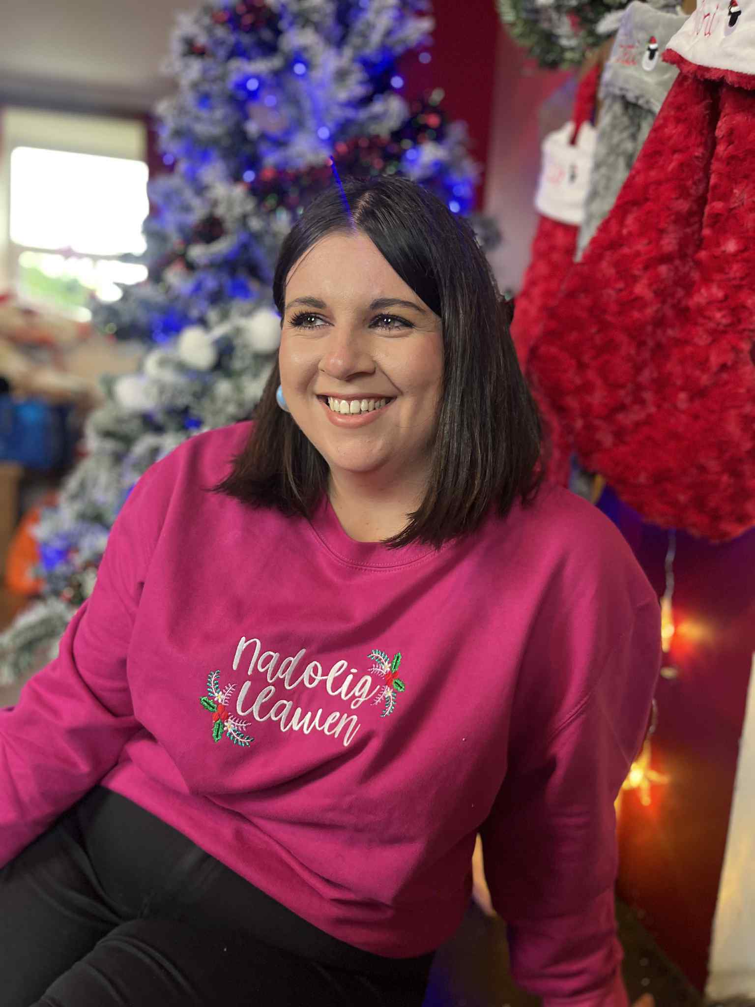 Dwi mor gyffrous i ddangos un o dri dyluniad ar gyfer ein siwmperi Nadolig leni... y wreath sparkly!
