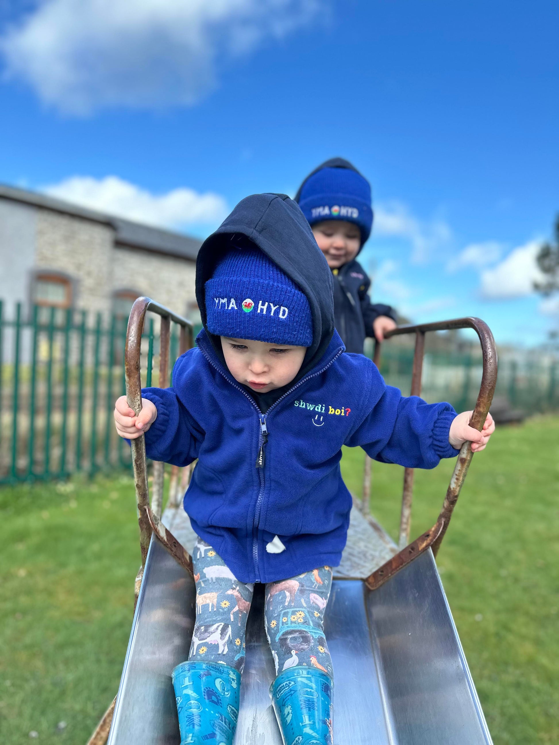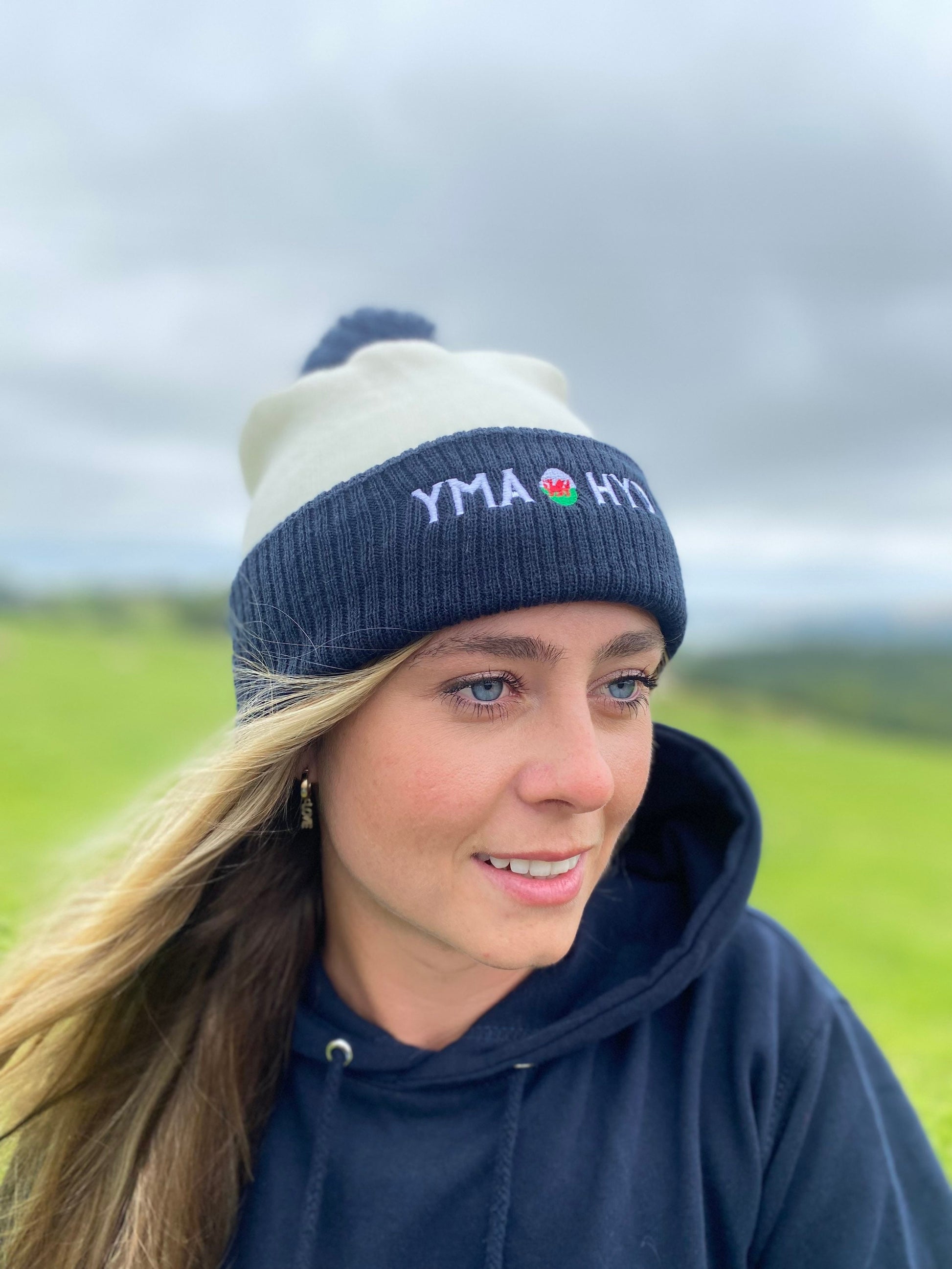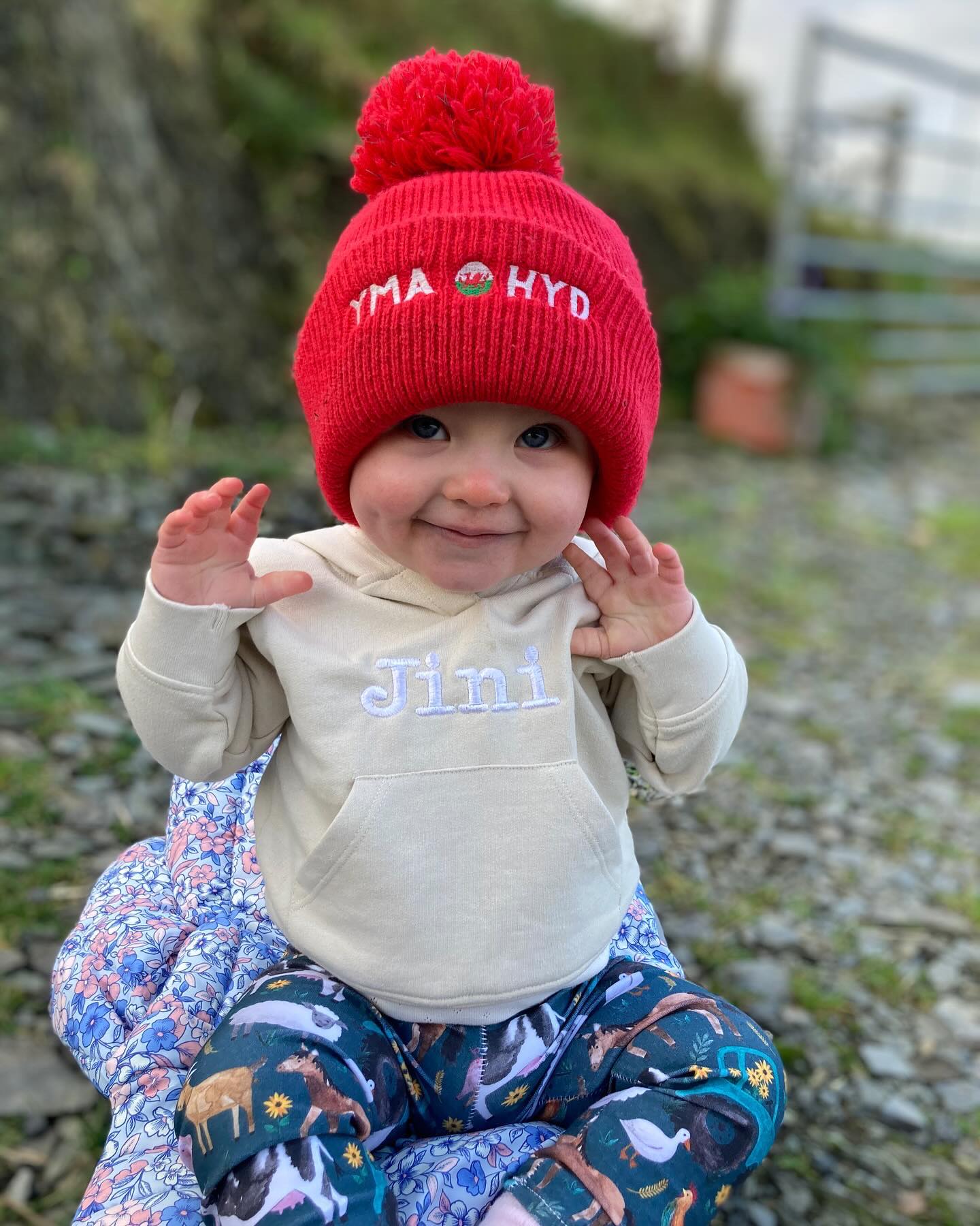 (Mae'r het yn ffitio Sianco (1 oed) can ei bod hi'n ymestyn yn fwy, hefyd yn ffitio plant cynradd. Os bod pen mawr, efallai'n well mynd am het oedolyn, rheiny llawer yn fwy)