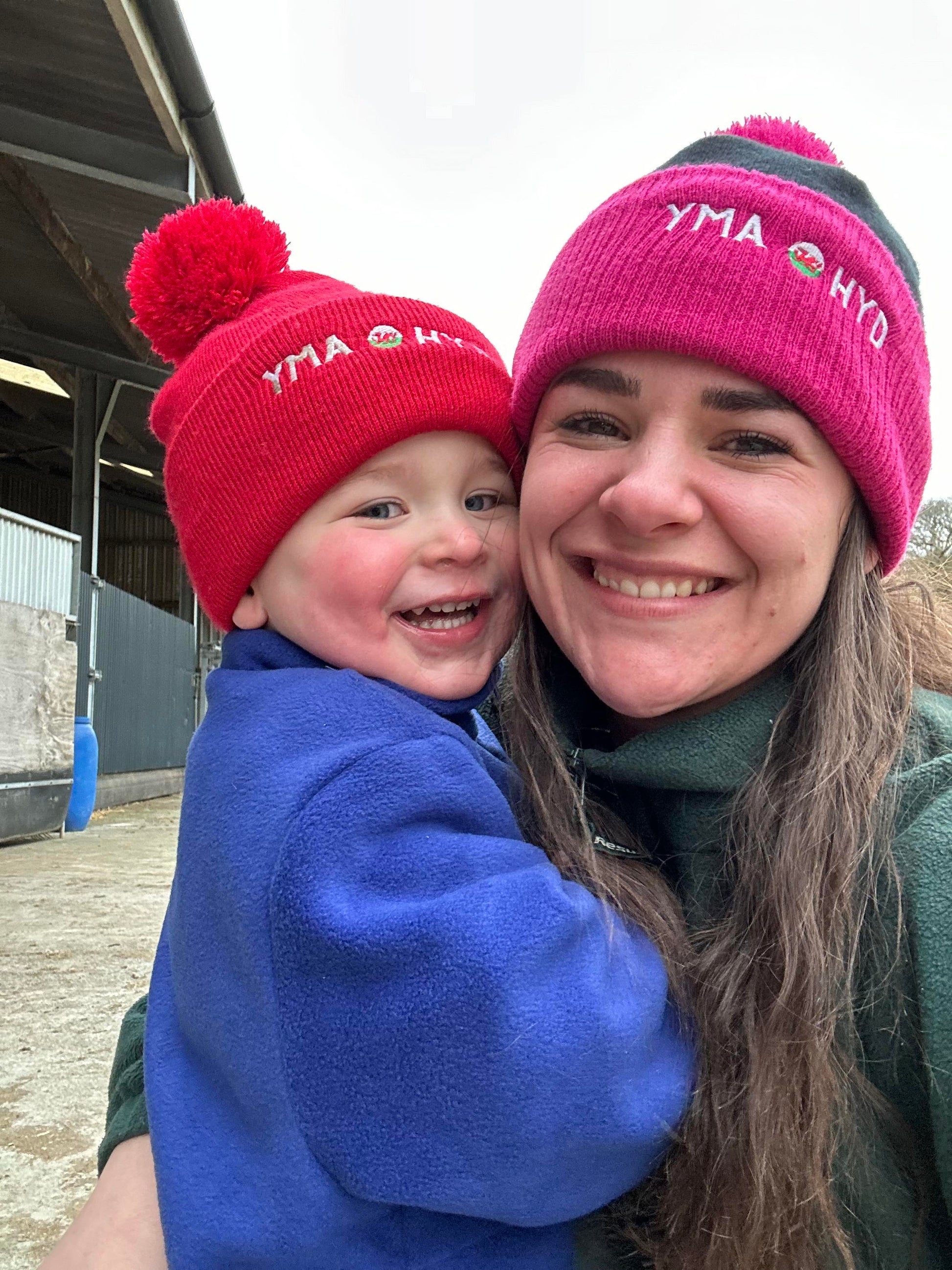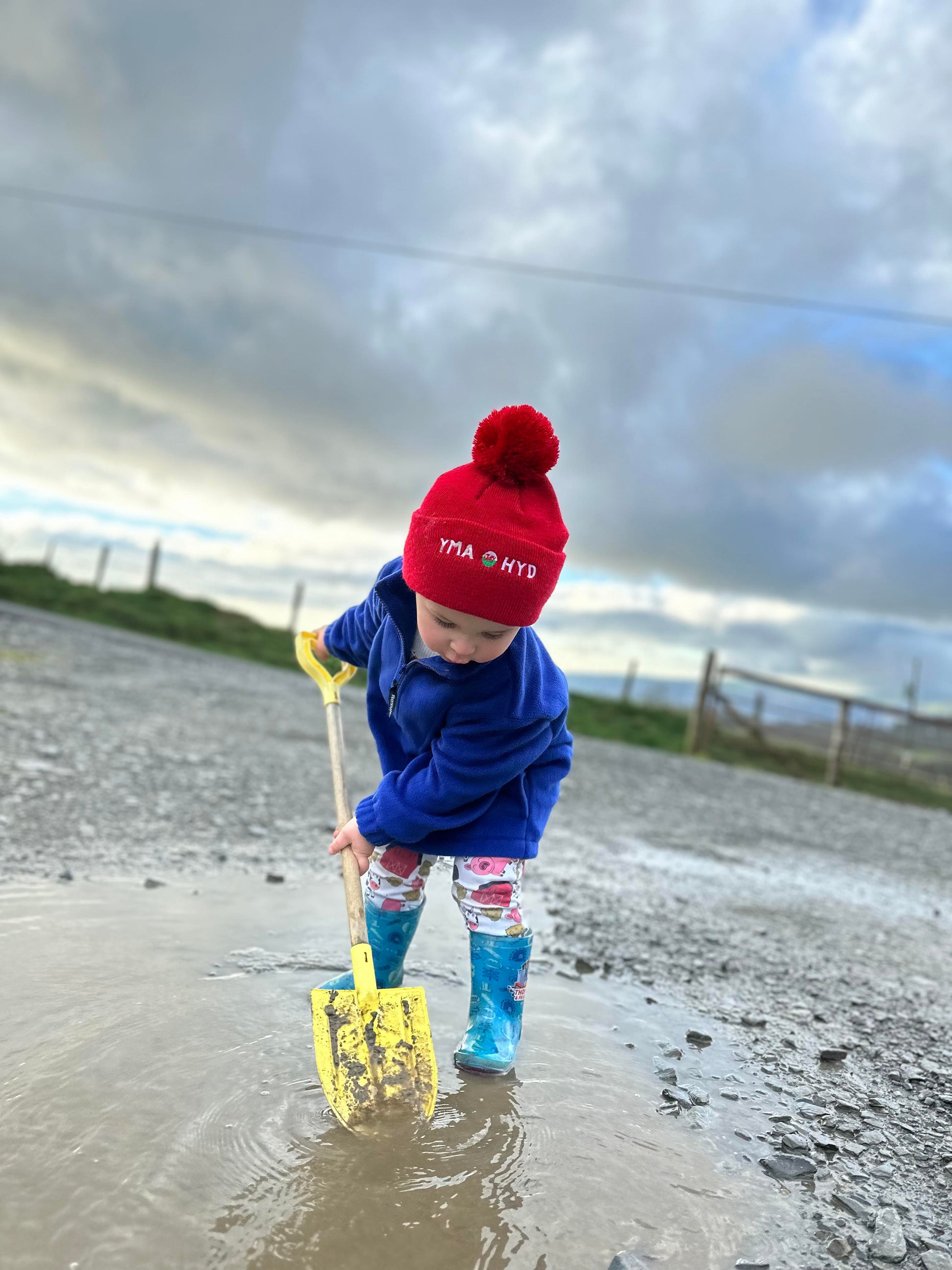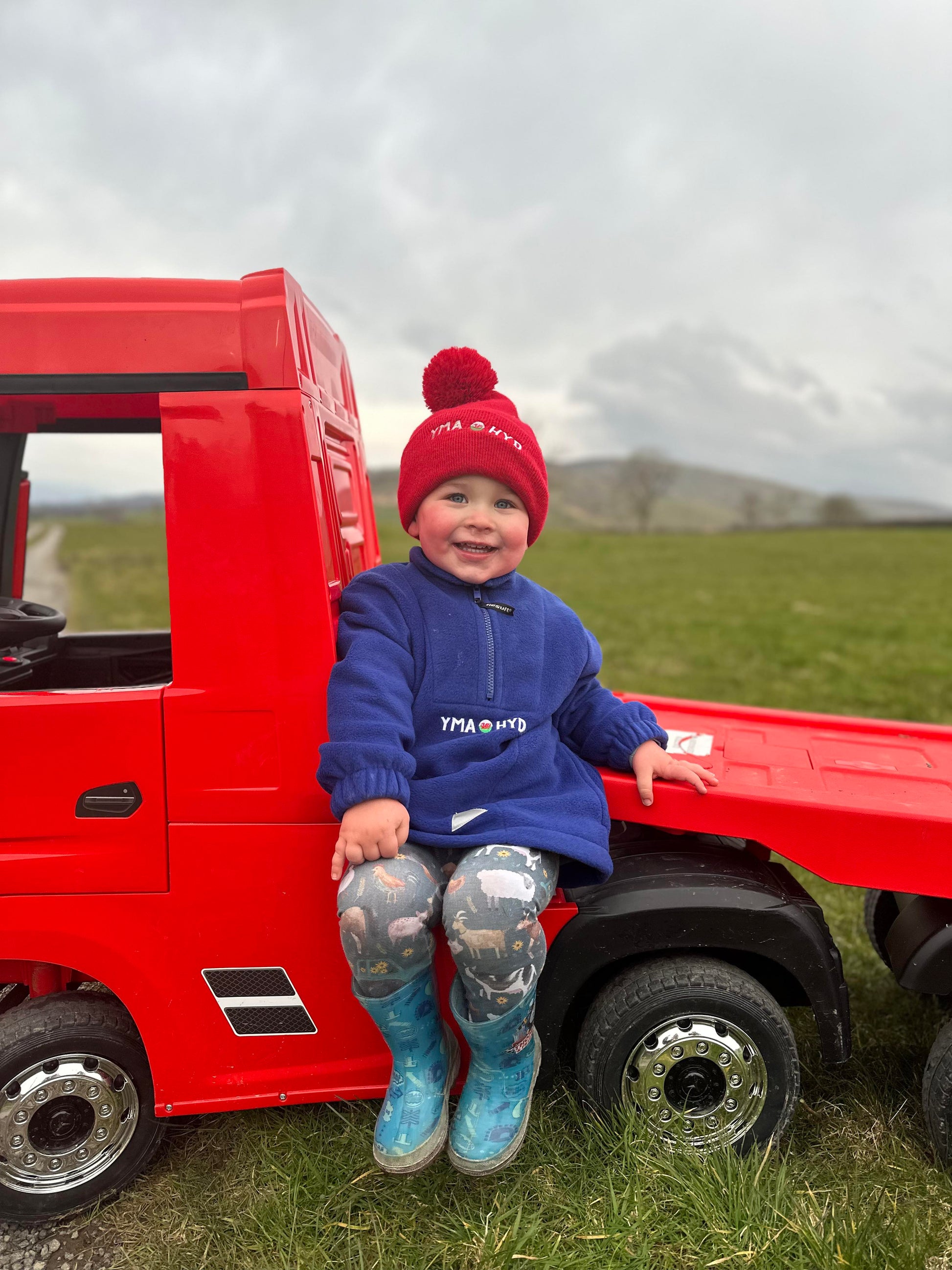 (Mae'r het yn ffitio Sianco (1 oed) can ei bod hi'n ymestyn yn fwy, hefyd yn ffitio plant cynradd. Os bod pen mawr, efallai'n well mynd am het oedolyn, rheiny llawer yn fwy)